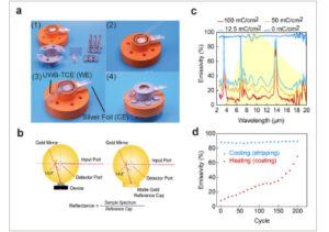 Alat ukur emisivitas dan hasilnya. a) Thermo-EVED untuk pengukuran emisivitas. (1)–(4) merupakan prosedur perakitan. b) Konfigurasi pengukuran reflektivitas dengan bola emas difusi terpadu dalam spektroskopi inframerah transformasi Fourier (FTIR). c) Spektrum emisivitas sebagai fungsi kapasitas muatan yang diendapkan secara elektrode. d) Emisivitas rata-rata tertimbang pada kondisi pendinginan dan pemanasan versus siklus peralihan.