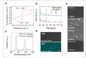 Mekanisme penyetelan emisivitas dan analisis karakterisasi. a) Voltammogram siklik elektrolit BMIMBF 4 menggunakan Ag sebagai elektroda referensi semu. Laju pemindaian adalah 50 mV s −1 dengan lapisan perak sebagai elektroda lawan dan UWB-TCE sebagai elektroda kerja. b) Analisis XRD dan c) XPS dari film yang diendapkan secara elektrode. d) Gambar SEM dan pemetaan EDS dari film Ag yang diendapkan. e) Gambar SEM pada kapasitas pengisian yang berbeda.