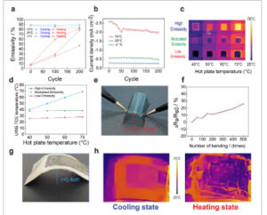 Uji perangkat pada suhu dan sifat mekanis yang berbeda. a) Emisivitas rata-rata tertimbang pada kondisi pendinginan dan pemanasan versus siklus pada 75, 25, dan −2 °C. b) Kepadatan arus dalam uji siklus hidup pada 75, 25, dan −2°C, yang menggambarkan korelasi positif antara aktivitas elektrokimia dan suhu. c) Gambar termal perangkat elektrokromik pada emisivitas dan suhu pelat panas yang berbeda. Perhatikan emisivitas termodulasi berarti Thermo-EVED dikontrol secara aktif untuk menstabilkan kehilangan panas radiatif. d) Suhu nyata rata-rata yang diukur oleh kamera termal. e) Gambar konfigurasi uji tekukan. f) Uji tekukan siklik dengan radius tekukan 0,67 cm. g) Gambar uji tekukan perangkat. h) Gambar termal perangkat elektrokromik pada kondisi tekukan.